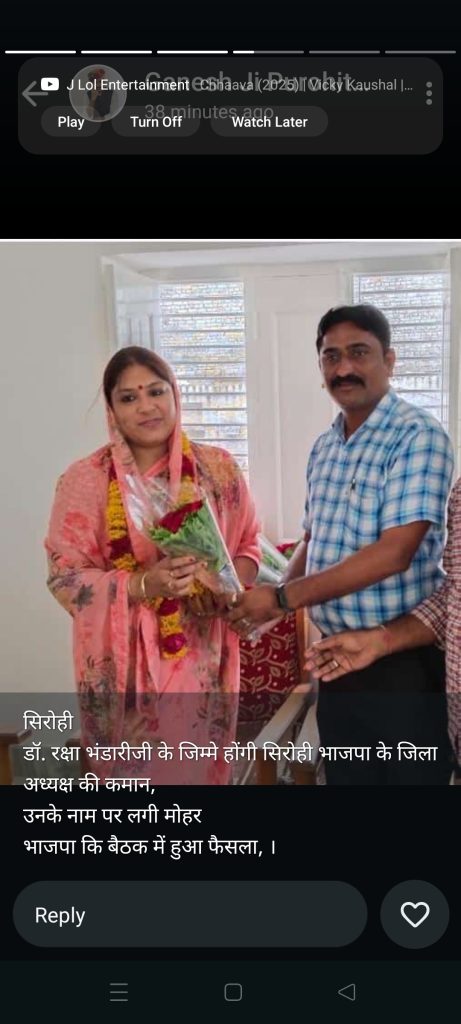 डा. रक्षा भंडारी को सिरोही जिले की भारतीय जनता पार्टी की कमान की जिम्मेदारी सौंपी कही दिनों से भाजपा जिला अध्यक्ष के लिए चल रही थी कश्मकश आज आखिर ज़िला अध्यक्ष की पूर्ण हुई प्रक्रिया जिले भर से आए हुए सैकड़ों लोगों में से 15वरिष्ठ कार्यकर्ताओं ने की जिला अध्यक्ष पद की दावेदारी पेश की